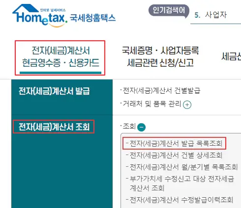 - 전자(세금)계산서 현금영수증ㆍ신용카드 > 전자(세금)계산서 발급목록 조회 메뉴를 클릭하세요.